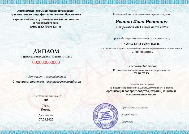 Выдается выдается выпускникам с любым базовым высшим или средним профессиональным образованием. Подтверждает вашу квалификацию специалиста лесного и лесопаркового хозяйства. Действует на всей территории РФ.
