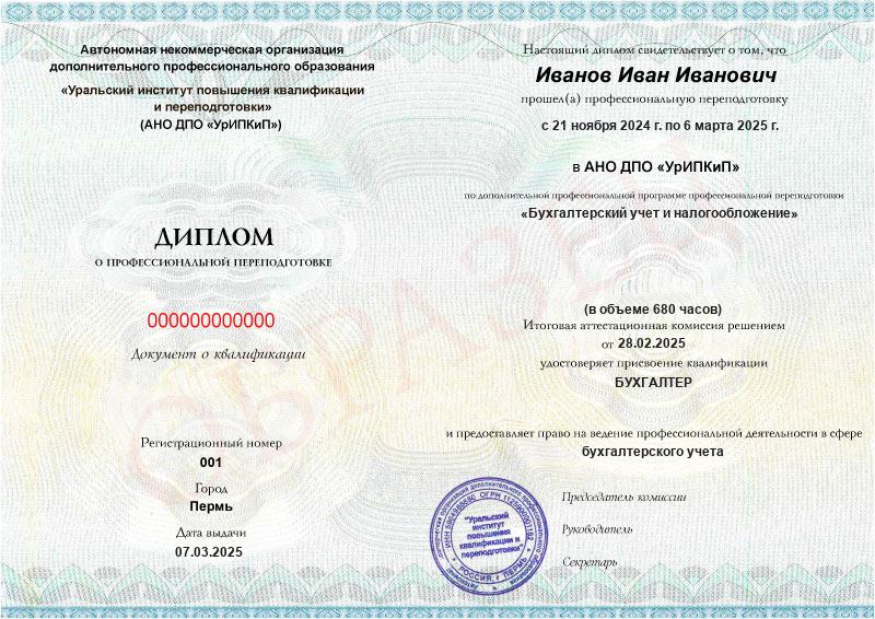- Образец диплома о профессиональной переподготовке.