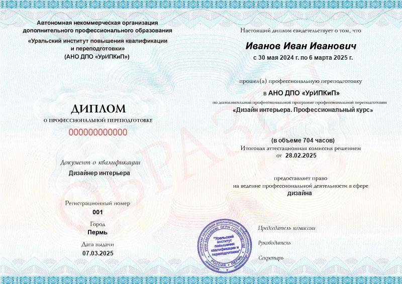 - Московский диплом о профессиональной переподготовке установленного образца с присвоением квалификации «Дизайнер интерьера».