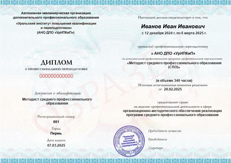 - Образец диплома о профессиональной переподготовке.