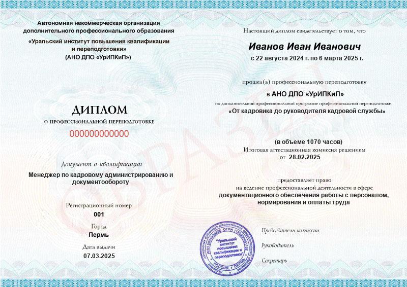 - Образец диплома о профессиональной переподготовке.
