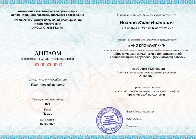 Да, дипломы и удостоверения оформляются в соответствии с действующим законодательством РФ. Документы печатаются на специальных бланках, заверяются печатью АНО ДПО «УрИПКиП».