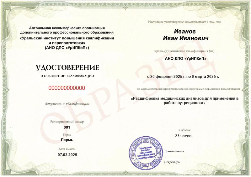 Удостоверение о повышении квалификации «Расшифровка медицинских анализов для применения в работе нутрициолога».