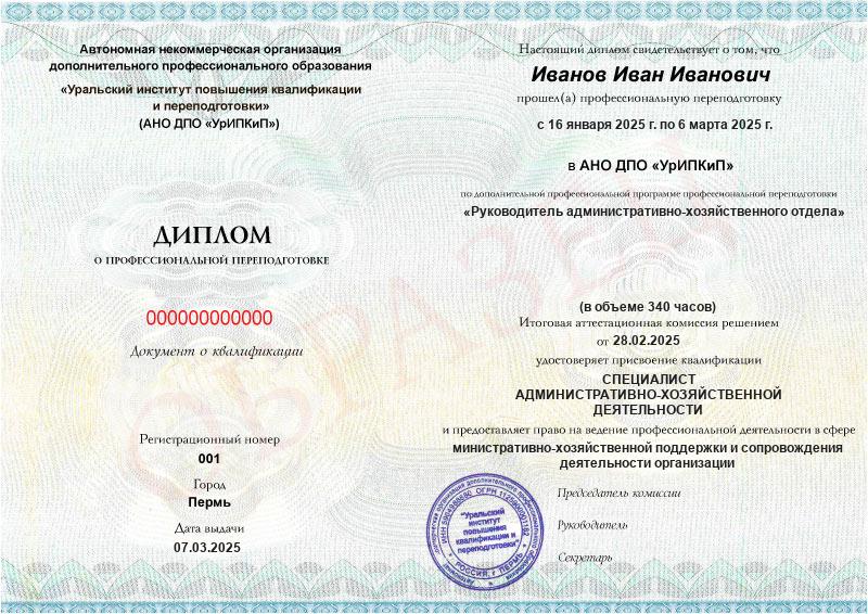- Образец диплома о профессиональной переподготовке.